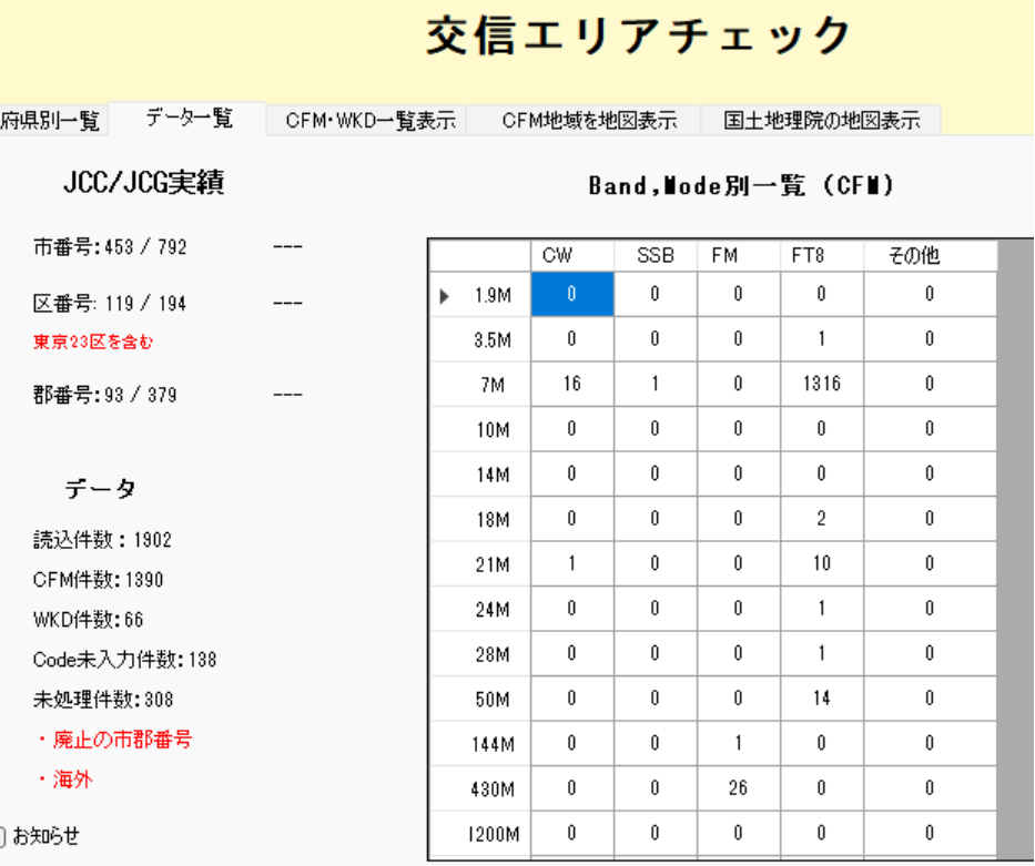 基本画面 ハムログのデータを読み込み、集計した結果を表示します JCC/JCG実績 達成数/総数を表示 CFM件数一覧 周波数、モードごとに集計結果を表示 エリア選択(都道府県) 対象エリア内の全市区郡がCFMになると背景色が緑色 (例) 沖縄県 |